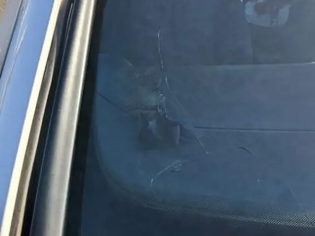 Mașina are ciupituri de la pietre și parbrizul este crăpat pe partea dreapta, nu împiedică vizibilitatea