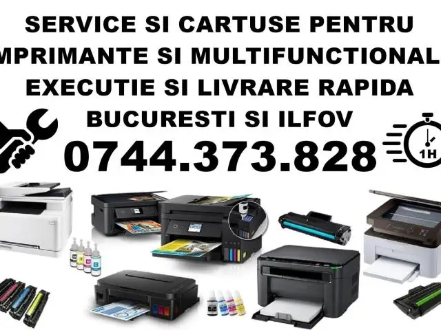 Oferim servicii de reparatii imprimante pt.o gama diversificata de echipamente Epson, HP,Xerox,Canon,Lexmark,Kyocera,Konica Minolta,Brother,Samsung etc. Executie rapida in max. 2 ore la sediul societatii dvs. in Bucuresti si Ilfov in baza comenzii confirmate si acceptate cu datele pentru facturare.Evitati stresul traficului prin Bucuresti cu ajutorul ofertei noastre care cuprinde vanzare cartuse si servicii de reparatii imprimante la sediul societatii dvs. Exclusiv B2B.Preturi de la 75 lei in functie de tipul imprimantei, starea tehnica, complexitatea reparatiei, iar in cazul serviciului de reincarcare cartuse, incarcari cartuse in functie de imprimanta, capacitate de printare, starea tehnica. Contact: 0744373828