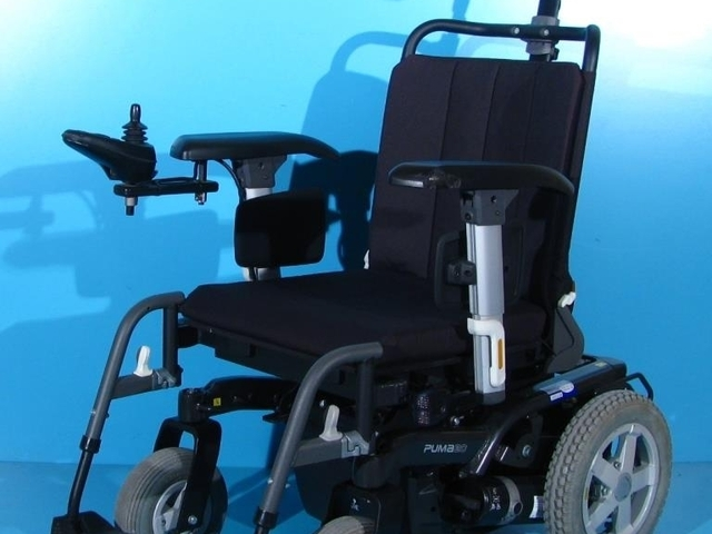 Scaun cu rotile electric second hand cu comanda pe joystick destinat persoanelor cu handicap si persoanelor cu deficiente locomotorii.