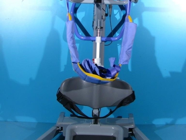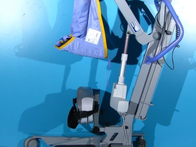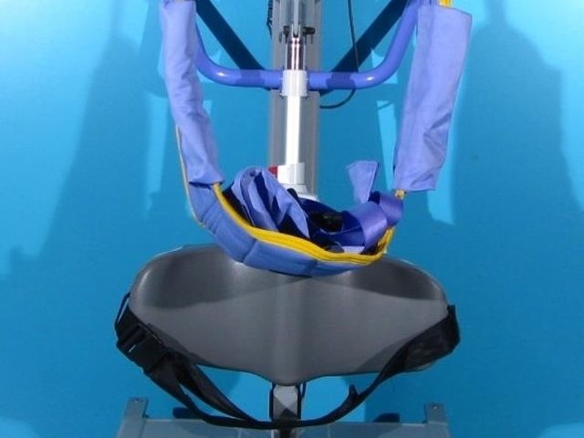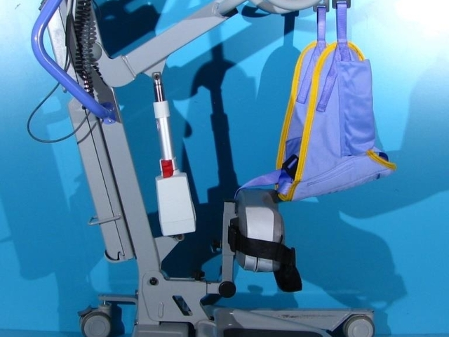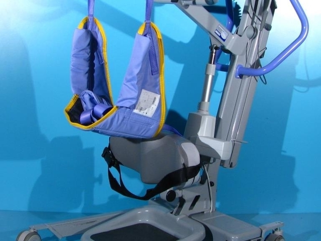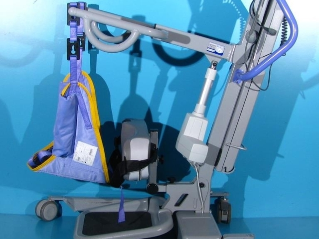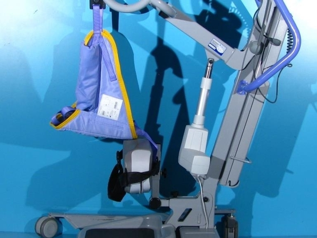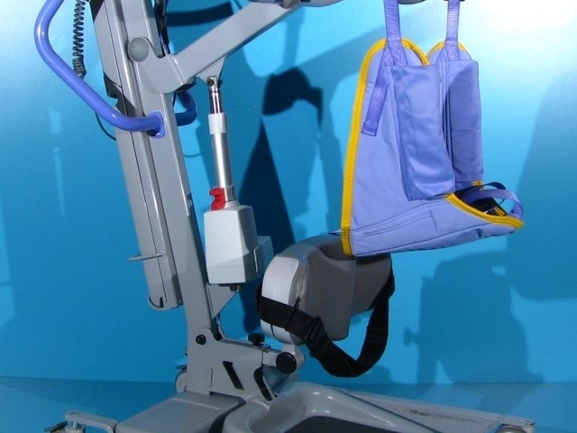 Acest dispozitiv de ridicat si transportat pacienti este dotat cu telecomanda care actioneaza bratul de ridicare si distanta intre picioare, si ham cu sistem de siguranta.