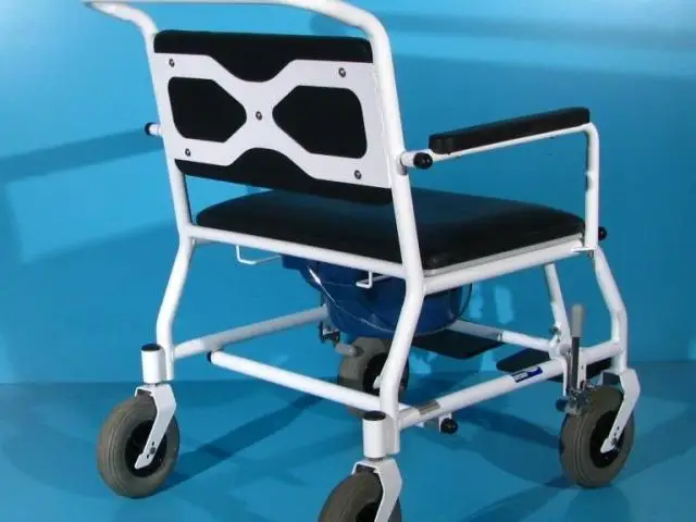Scaun handicap cu wc (toaleta), cu rotile destinat persoanelor supraponderale cu nevoi speciale.