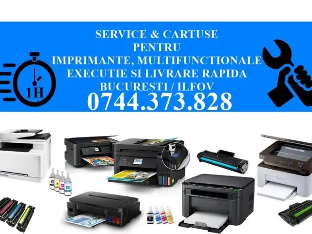 Service imprimante si copiatoare la sediul societatii clientului în București și Ilfov. Executie rapida cu livrare gratuita in max. 2 ore la sediul societatii dvs. in Bucuresti si Ilfov in baza comenzii confirmate si acceptate, cu datele pentru facturare.Exclusiv B2B.Preturi de la 75 lei in functie de tipul echipamentului, starea tehnica, complexitatea interventiei, iar in cazul consumabilelor in functie de brand, capacitate printare si modalitate de ambalare.Contact: 0__7__4__4__3__7__3__8__2__8