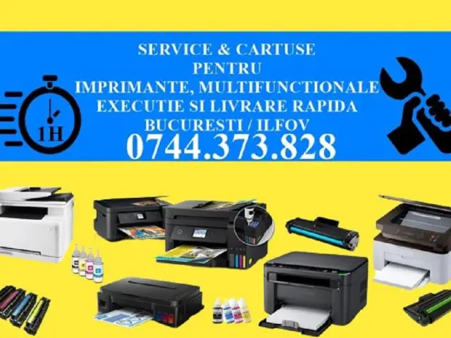 Oferim servicii de reparatii imprimante pt.o gama diversificata de echipamente Epson, HP,Xerox,Canon,Lexmark,Kyocera,Konica Minolta,Brother,Samsung etc. Executie rapida in max. 2 ore la sediul societatii dvs. in Bucuresti si Ilfov in baza comenzii confirmate si acceptate cu datele pentru facturare.Evitati stresul traficului prin Bucuresti cu ajutorul ofertei noastre care cuprinde vanzare cartuse si servicii de reparatii imprimante la sediul societatii dvs. Exclusiv B2B.Preturi de la 75 lei in functie de tipul imprimantei, starea tehnica, complexitatea reparatiei, iar in cazul serviciului de reincarcare cartuse, incarcari cartuse in functie de imprimanta, capacitate de printare, starea tehnica. Contact: 0744373828